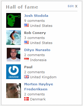 In this guide we will create a widget called Most comments and you can see it live on this site where it is called Hall of fame. The widget lists the people who have written most comments in the last x number of days.