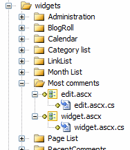 You start by creating a new folder in the widgets folder. The name of the folder will be the name of the widget as well. In the new folder you have to add a user control called widget.ascx. If the widget contains settings that the blog owner should be able to change, then you have to add another user control called edit.ascx. It’s important that you name them exactly widget.ascx and edit.ascx.